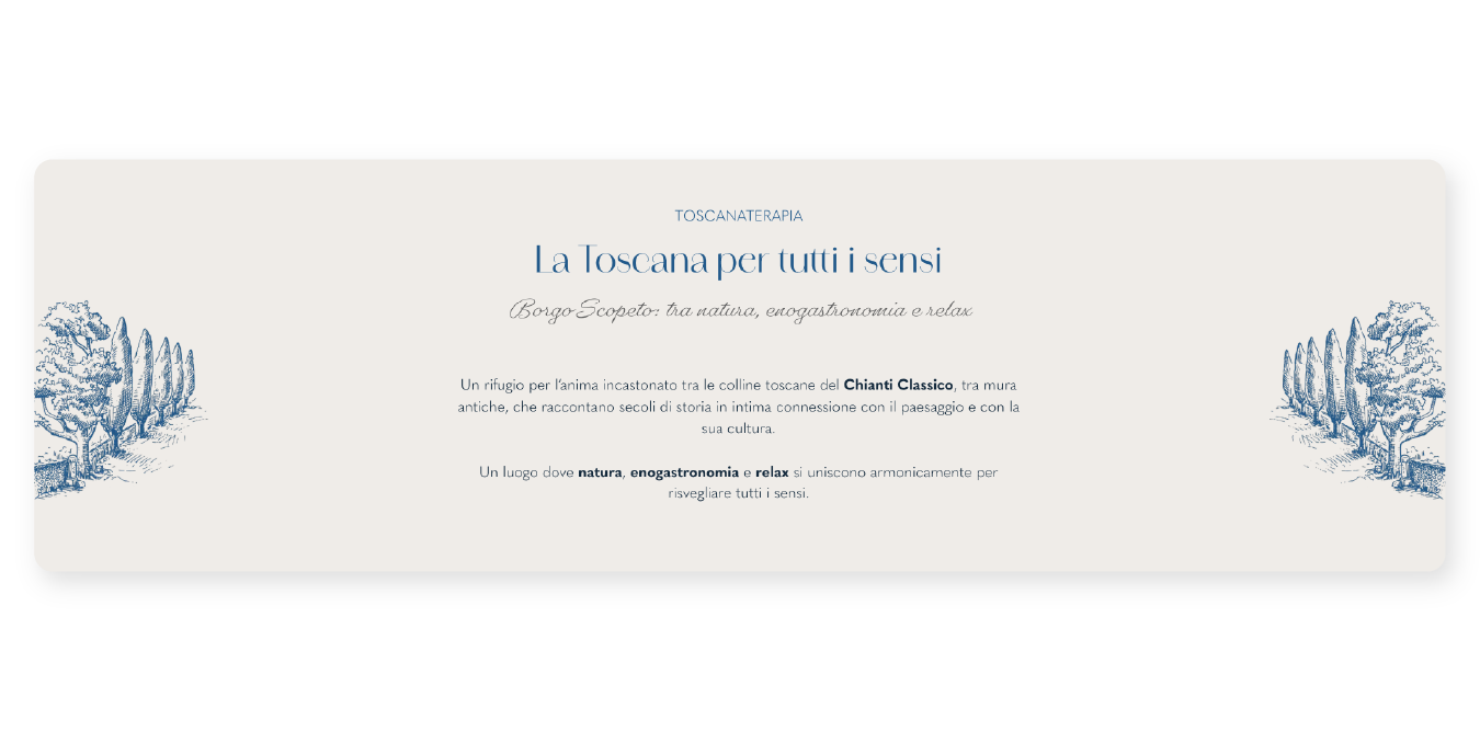 In addition to classic photographs, customised illustrations can be adopted to provide added character and originality. These images can be used as the header of one or more pages, to conjure up suggestive atmospheres that transport the user to an exclusive world, as is the case on the Torre Capranica and Palazzo Caruso sites. Alternatively, they can be used more subtly, as decorative elements that intersperse the photographic sections and emphasise the content of the paragraphs: an excellent example of this is the Borgo Scopeto site, with small woodcut-style drawings that are a reference to the Tuscan nature where the resort is located.