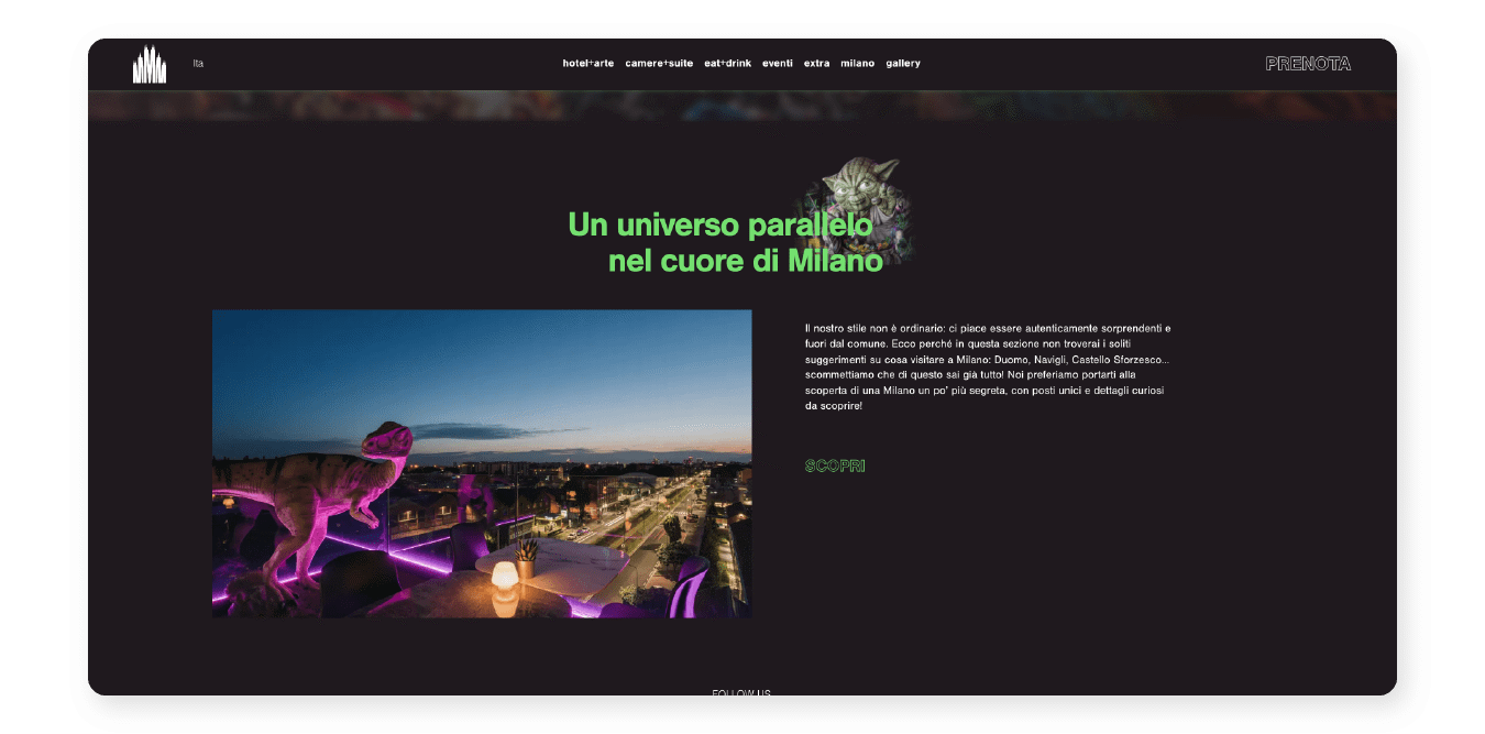 A property that focuses on a unique personality should also choose the same strategy for its website, with attention-grabbing images in the application, striking and evocative texts, bright colours and bold animation choices. To understand what we mean, just browse the Collini Rooms website: the colourful and unconventional spaces of this Milanese property, designed to transport guests into another reality, find their natural continuity online, with a mix of impactful graphics and direct phrases.