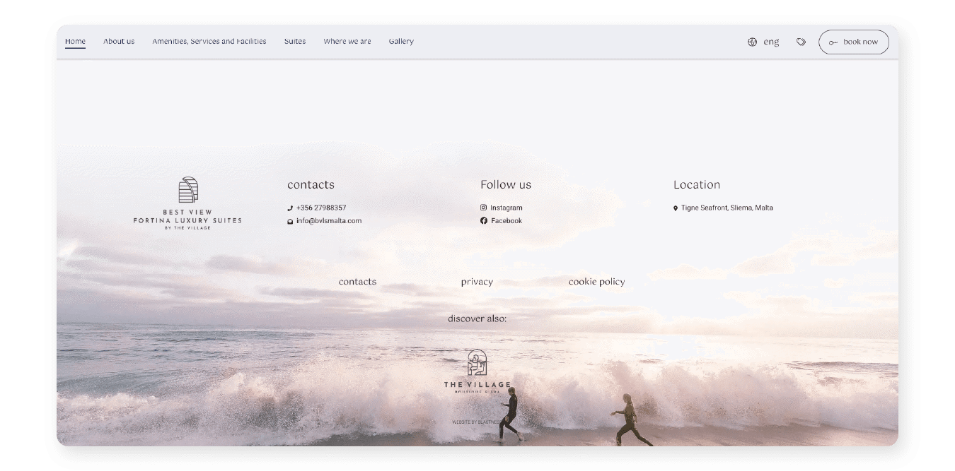 There are more and more hotel sites where the footer is not just an area for information, but becomes a real design element that embellishes the aesthetics of the site and takes users on an emotional journey down to the last pixel. Would you like some examples? Best View Fortina Luxury Suites uses a photo with neutral colours that, aside from being the perfect background for all the relevant information, completes the navigation with a strongly evocative image, as if to bring the story to a close. The Porto Roca hotel opts instead for a simple but high-impact video.
