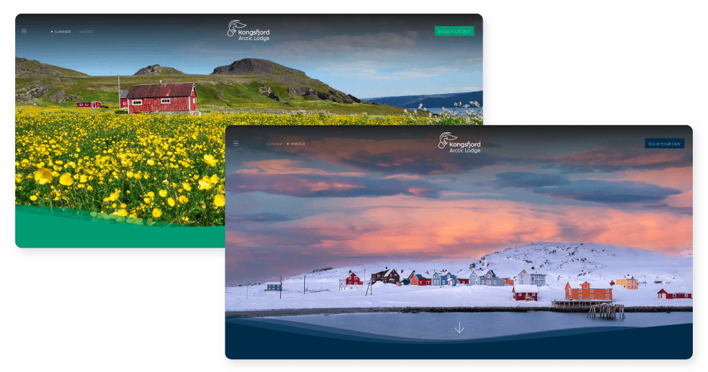 One of the latest trends in hospitality websites is the enhanced customisation of the interface depending on the time of year or day, with a switch button on the homepage. This trend proves particularly effective for hotels whose mood changes drastically with the passing of the seasons, as is the case with the Kongsfjord Arctic Lodge on the Norwegian fjords or the Hotel Regina in the Swiss Alps, which display different activities and colour choices on the homepage depending on the chosen season. This solution can also be adopted to show off the beauty of the view, both during the day and at night: this is the case of Villa Athena Agrigento, which successfully makes the most of its unique position on the Valle dei Templi, displaying it in all its splendour, under the sun or illuminated by moonlight.