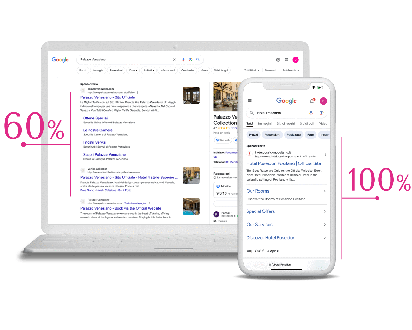 In un'epoca in cui la ricerca di informazioni e la prenotazione delle strutture ricettive avviene principalmente attraverso internet e le inserzioni sponsorizzate dominano la SERP, occupando il 60% dello spazio fisico su desktop e addirittura il 100% sui dispositivi mobile, per essere competitivi nel settore dell'ospitalità non è semplicemente necessario investire in campagne di search e metasearch advertising: è ormai fondamentale farlo in modo professionale, rivolto alla performance e ottimizzando con precisione investimenti e allocazione del budget.