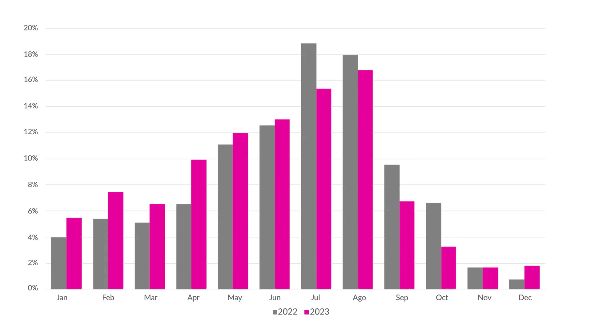 Il grafico di seguito mostra gli investimenti pubblicitari di una struttura di lusso nel nord Italia che sia nel 2022 (in grigio) che nel 2023 (in fucsia) ha adottato un approccio Always on con un incremento di budget pari al 26% nel 2023. Dal confronto tra i due anni si nota come solo nel mese di novembre gli investimenti sostenuti sono in linea con quelli dell'anno precedente: se l’allocazione del budget avesse seguito lo storico ci sarebbe stata una dispersione del budget in mesi come luglio o agosto, mentre in mesi come febbraio e aprile la spesa stanziata in anticipo sarebbe stata insufficiente a raggiungere gran parte della domanda.
