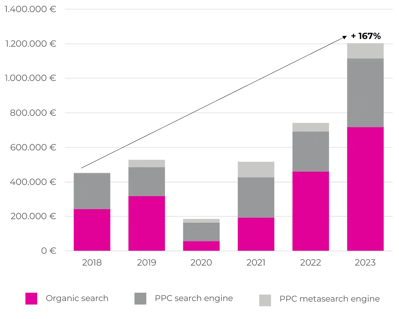 Un’altra domanda frequente tra gli albergatori che si affacciano per la prima volta al mondo delle campagne advertising riguarda i risultati in organico: il timore più frequente, infatti, è che un aumento nelle prenotazioni da attività di advertising si traduca automaticamente in una diminuzione delle prenotazioni dirette ed organiche. Come si vede in quest’ultimo grafico, che mostra la provenienza delle prenotazioni di una resort costiero nel Sud Italia dal 2018 al 2023, l'aumento nelle prenotazioni derivanti da campagne di advertising su motori e metamotori funge da traino per la crescita delle prenotazioni organiche, in un circolo virtuoso che si traduce in evidenti miglioramenti del business dell’hotel.