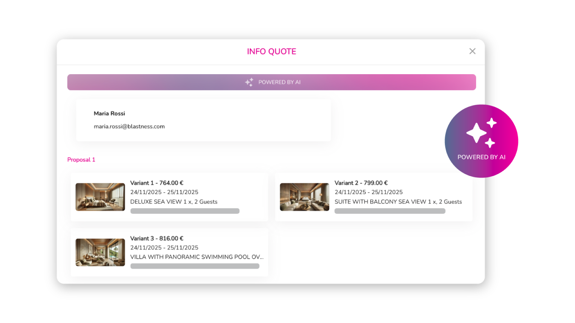 L’hyper-personalisation prende forma concreta attraverso due soluzioni sviluppate da Blastness. Il CRM consente agli hotel di raccogliere, strutturare e interpretare i dati dei propri ospiti in modo sistematico: abitudini di acquisto, preferenze ricorrenti e comportamenti di navigazione. Queste informazioni diventano la base per generare automaticamente offerte, preventivi e comunicazioni calibrati sul singolo cliente, creando un’esperienza coerente lungo tutte le fasi del processo decisionale.