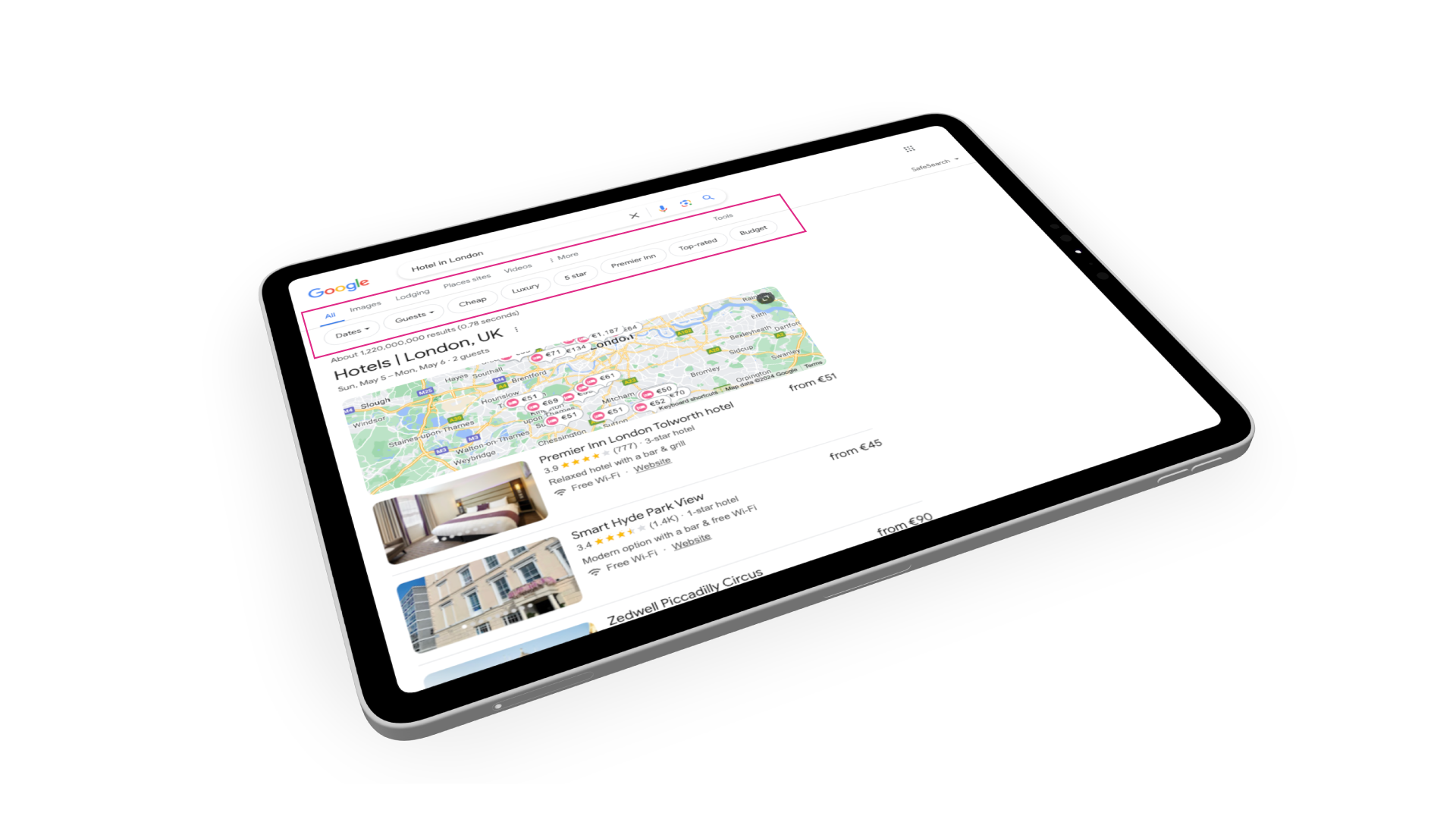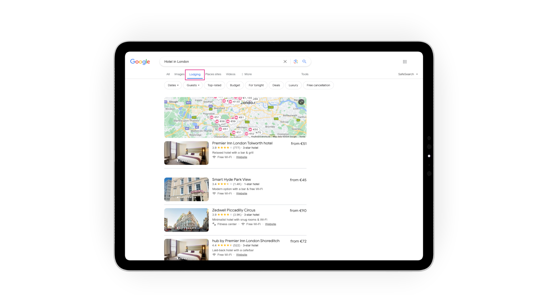 Un altro cambiamento è l'introduzione della funzione "Alloggio", che appare quando si cerca "hotel" seguito da una località (ad esempio, "hotel a Londra"). La pagina presenta inserzioni sponsorizzate, seguite da un elenco delle attività. Cliccando sul prezzo, si apre a lato il profilo Google My Business dell'inserzione selezionata. Questa nuova funzionalità rende quindi più importante che mai ottimizzare il proprio profilo Google My Business e condividere le proprie tariffe con Google, oltre che sostenere il profilo con attività di advertising. È anche interessante notare come, entro i limiti imposti dal DMA, Google stia procedendo verso un'esperienza di ricerca più visiva, con l'introduzione sempre più frequente di caroselli di immagini sia nelle ricerche organizzate che nelle inserzioni a pagamento.