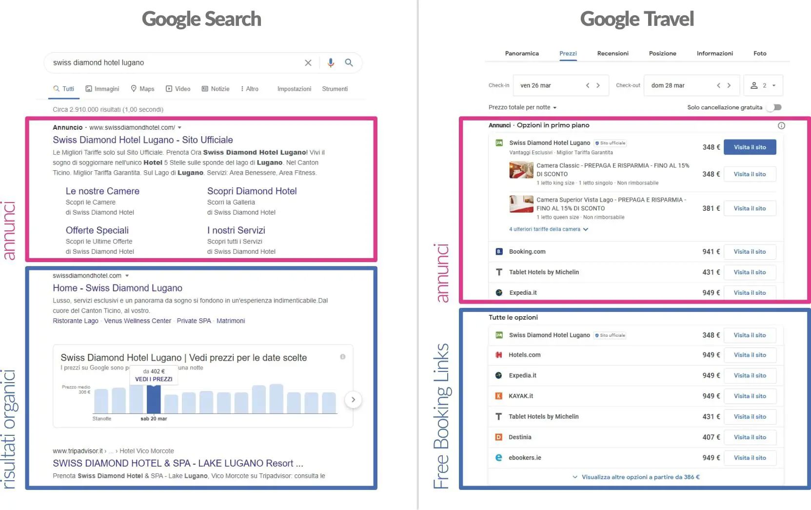 Così come nel caso dei risultati delle pagine di ricerca, la nuova funzione organica non è in alcun modo equiparabile alle inserzioni a pagamento. Per questo motivo le principali OTA non si affidano soltanto ai Free Booking Links, ma, anzi, investono sempre di più in advertising anche su Google Hotel Ads.