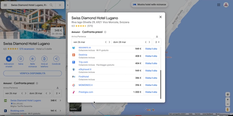 Su Google Maps la dinamica è analoga. Selezionando un hotel specifico, il portale mostra solamente le tariffe degli inserzionisti Google Hotels Ads con campagne attive e senza la possibilità di visualizzare i Free Booking Links.