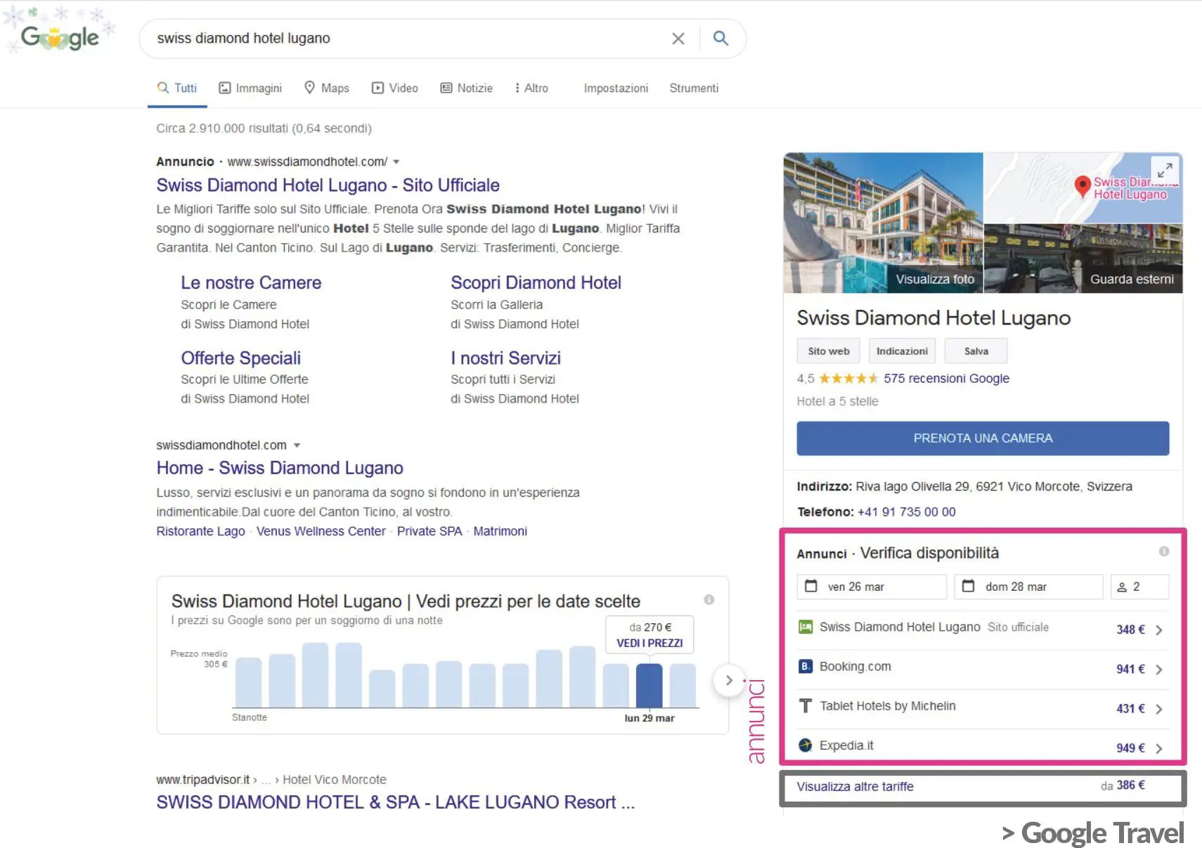A dimostrazione dell’importanza e dell’efficacia degli annunci Google Hotel Ads, è facile verificare come per la maggior parte degli hotel, nella tab “Prezzi” di Google Travel le OTA (in particolare Booking.com) ricoprano posizioni dominanti grazie alle loro campagne di advertising. Anche oggi, nonostante la presenza dei loro Free Booking Links, le OTA non rinunciano alla visibilità e ai vantaggi garantiti dagli annunci a pagamento.