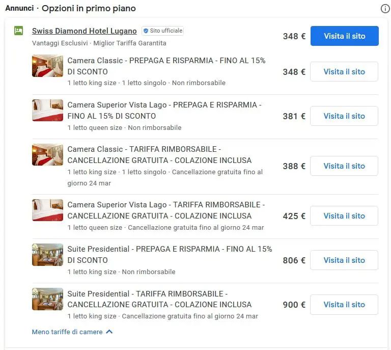 Analogamente a quanto avviene nei risultati del motore di ricerca, anche nella piattaforma Google Travel, emerge chiaramente come gli annunci siano più dettagliati e personalizzabili rispetto ai risultati organici. Infatti, se questi ultimi mostrano soltanto il tag “Sito ufficiale”, la tariffa più economica e la Cancellation Policy, negli annunci – lo ricordiamo – è possibile arricchire le informazioni inserendo estensioni callout, mostrando tutte le tipologie di camere e diverse offerte tariffarie e aggiungendo foto e testi ad hoc.